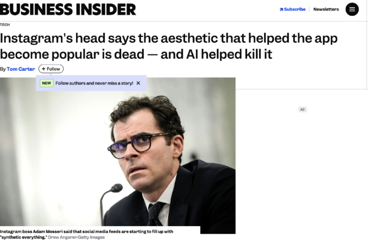 2026年1月1日《商业内幕》的报道证实了这一点,instagram负责人AdamMosseri声称,人工智能的兴盛正让Ins美学消亡: