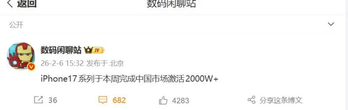 iPhone 17 系列自上市以来,持续领跑国内高端手机市场,展现出强劲的销售势头。据行业数据显示,该系列在本周国内激活量已突破 2000 万台,相当于平均每月售出超 500 万台。这一表现不仅显著超越了同期国产旗舰机的累计销量,也再次印证了苹果在消费电子领域的品牌号召力。